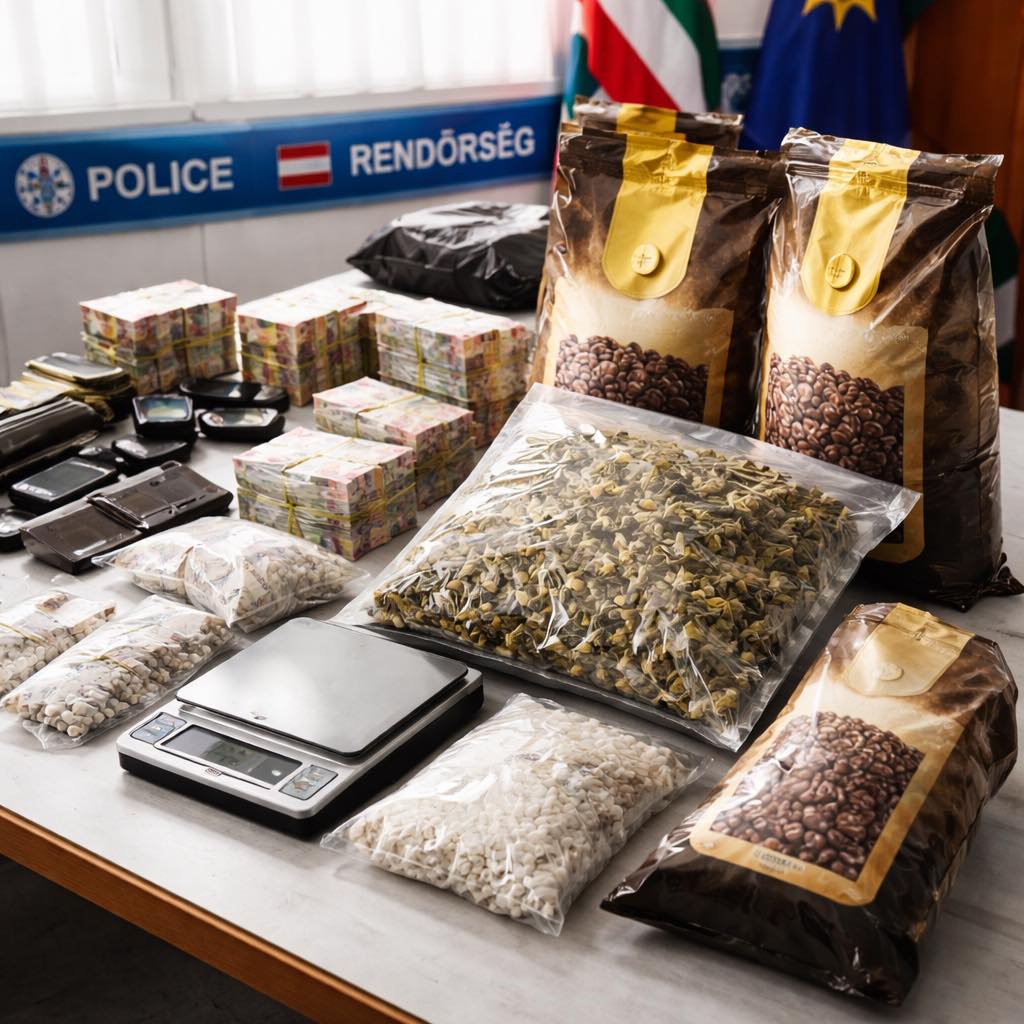 A csomagokon még illatnyílás is volt, hogy ellenőrzéskor valóban kávénak tűnjön. A rendőrök lefoglaltak továbbá 95,3 gramm amfetamint, 1746 gramm zöld növényi törmeléket, több mint 10 millió forint készpénzt, digitális mérleget és más eszközöket is.