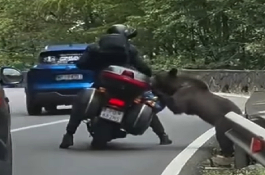 Egy kifejlett barnamedve megtámadta és megharapta a gyanútlanul várakozó motorost Vidraru-gát és Curtea de Argeș között. Az esetet egy autós fedélzeti kamerája rögzítette. Az úton épp álltak a járművek, mikor az állat hirtelen megjelent. A jelek szerint nem a férfi, hanem a csomagtartó tartalma érdekelte jobban.